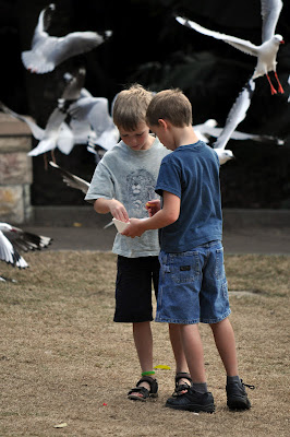 Today we went to South Bank to ride on the 'Wheel of Brisbane'. It is kind of like the London Eye but smaller. We went with friends who had a coupon for a half off. When we got there it was closed, so after all that we didn't get to ride anyway. It didn't really matter. It was a beautiful day and the kids ran around happily chasing birds and each other and we sat in the sun and chatted. It was a lovely way to spend a day. You can see in Levi's eyes that he is still tired and we are both getting better but not quite there with the jet lag thing!